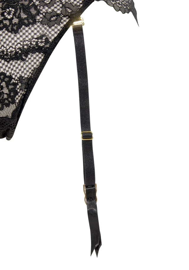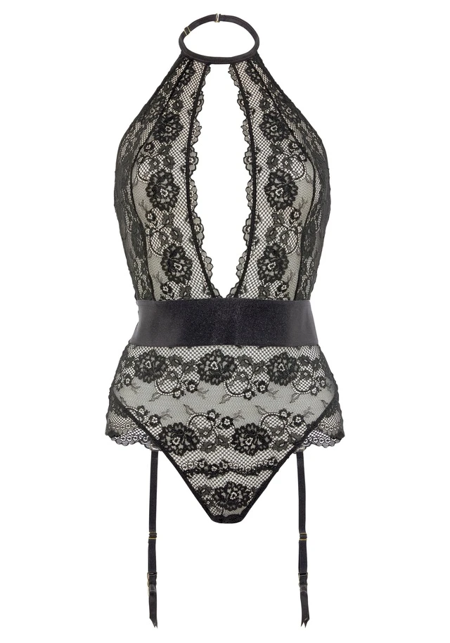 Body mit Neckholder von JETTE, kreiiert von der Designerin Jette Joop. Aus leicht transparenter, elastischer Spitze. Abnehmbare Strapse. Im Schritt aufhakbar mit Baumwollzwickel. Erotische Dessous. Reizvolle Dessous. Reizwäsche. Verführerische Dessous. Spitzen-Dessous. Romantische Dessous. Verspielte Dessous. Aus 89% Polyamid, 10% Elasthan, 1% Polyester