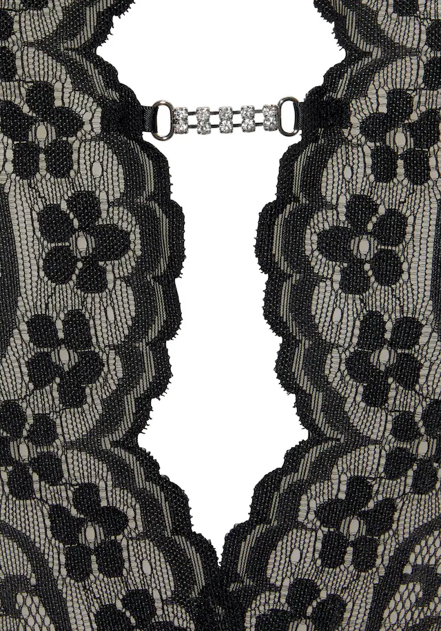 String-Body von Jette, kreiert von der Designerin Jette Joop. Ganz aus zarter Spitze, mit Strass-Accessoire vorn. Im Nacken zu schließen. Mit Baumwollzwickel. Erotische Dessous. Reizvolle Dessous. Reizwäsche. Verführerische Dessous. Spitzen-Dessous. Romantische Dessous. Verspielte Dessous. Aus 90% Polyamid, 10% Elasthan.