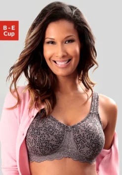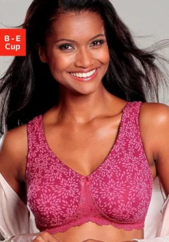 Schöner Entlastungs-BH ohne Bügel aus einer Mix & Match-Serie von NUANCE aus softer Baumwolle mit hübscher Jacquardspitze. Alles miteinander kombinierbar. Extra breite, entlastende Träger für einen hohen Tragekomfort. Flache Jacquard – spitze unterm Cup und in der vorderen Mitte. Hoch geschnittenes Rückenteil für einen guten Halt auch ohne Bügel. Träger und Rückenverschluss verstellbar. Klassische Dessous. Bequeme Alltags-Dessous. Modische Dessous. Aus 85% Baumwolle, 10% Polyamid, 5% Elasthan. BHs sind nicht trocknergeeignet, da die Versteller und Ringe durch die Hitze beschädigt werden und brechen.