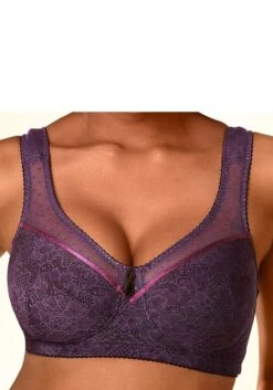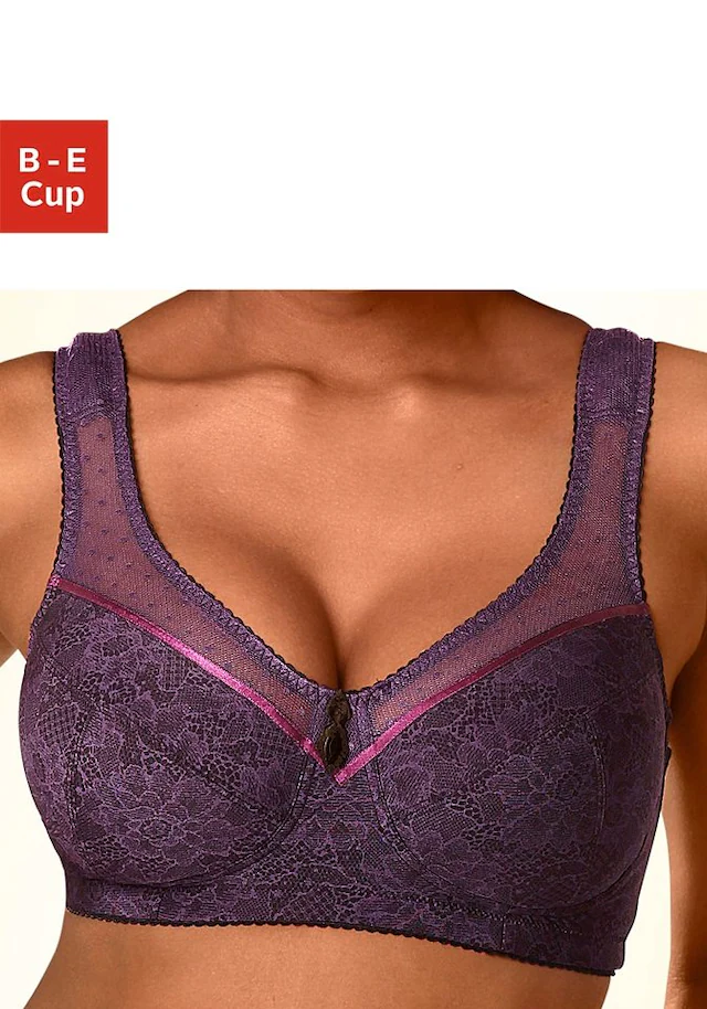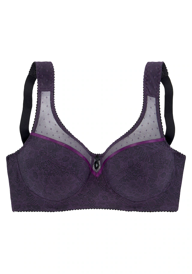 Mit modischem Spitzendruck. Ohne Bügel, mit extrabreiten, weich gefütterten Trägern für angenehmen Halt. Klassische Dessous. Bequeme Alltags-Dessous. Modische Dessous. Der Entlastungs-BH ist aus 72,5% Polyamid, 27,5% Elasthan. Seitliche Cupstütze innen, weicher Strukturnetzeinsatz am Cup. Träger und Rückenverschluss verstellbar. BHs sind nicht trocknergeeignet, da die Versteller und Ringe durch die Hitze beschädigt werden und brechen.