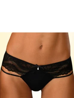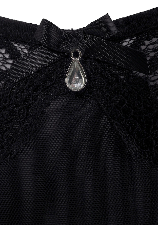 Tanga. Vorne mittig aus zartem Mesh, seitlich unt hinten aus elastischer Vollspitze. Dekorative Elastikbänder an den Seiten für einen sexy Look. Vorne mittig Glitzeraccessoire. Mit Baumwollzwickel. Aus 90% Polyamid, 10% Elasthan.
