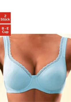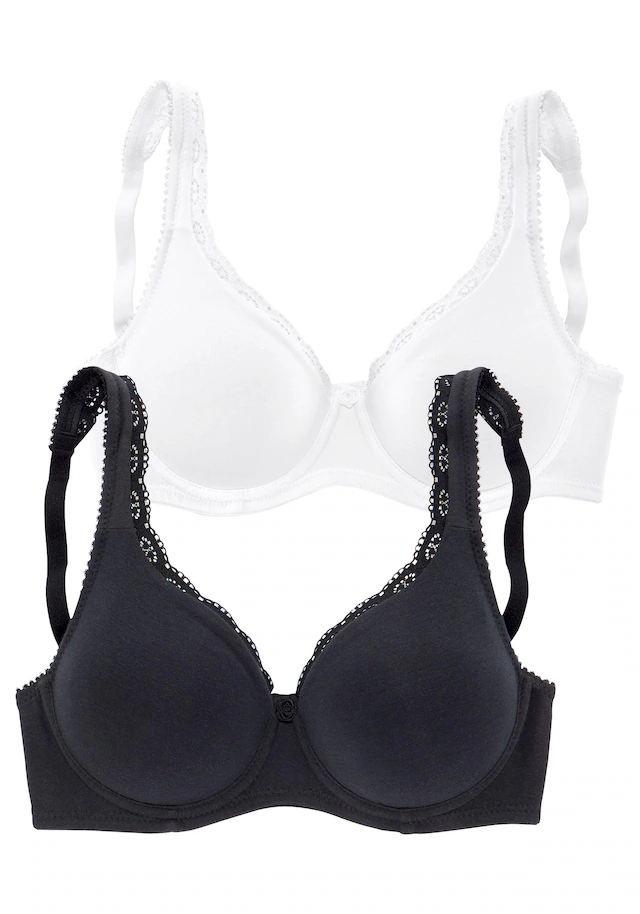 Petite Fleur: Bügel-BH im 2er-Pack mit nahtlos gearbeiteten Cups und dekorativer Spitzenkante am Cup. Träger und Rückenverschluss verstellbar. Klassische Dessous. Bequeme Alltags-Dessous. Modische Dessous. Aus 85% Baumwolle, 10% Polyamid, 5% Elasthan. BHs sind nicht trocknergeeignet, da die Versteller und Ringe durch die Hitze beschädigt werden und brechen.