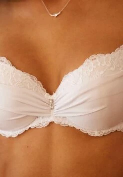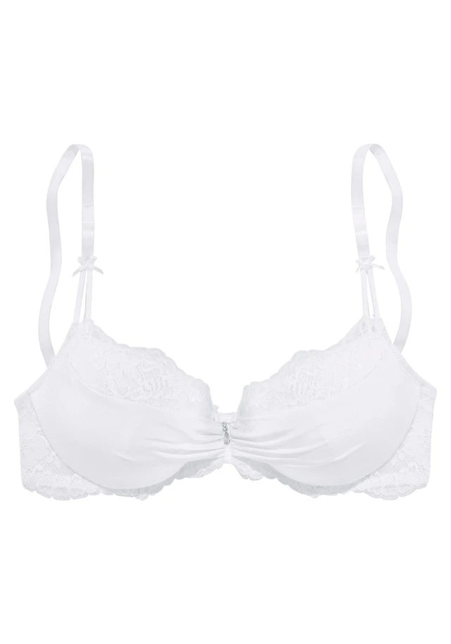 Femininer Push-up-BH mit herausnehmbaren Kissen . Untere Hälfte des Cups in edler Raffung mit Schmuckaccessoire. Cupkante in extravaganter Spitze gehalten. Individuell verstellbare Träger und Rückenverschluss. Mit passenden Unterteilen aus der gleichen Serie erhältlich. Obermaterial: 90% Polyamid, 10% Elasthan.